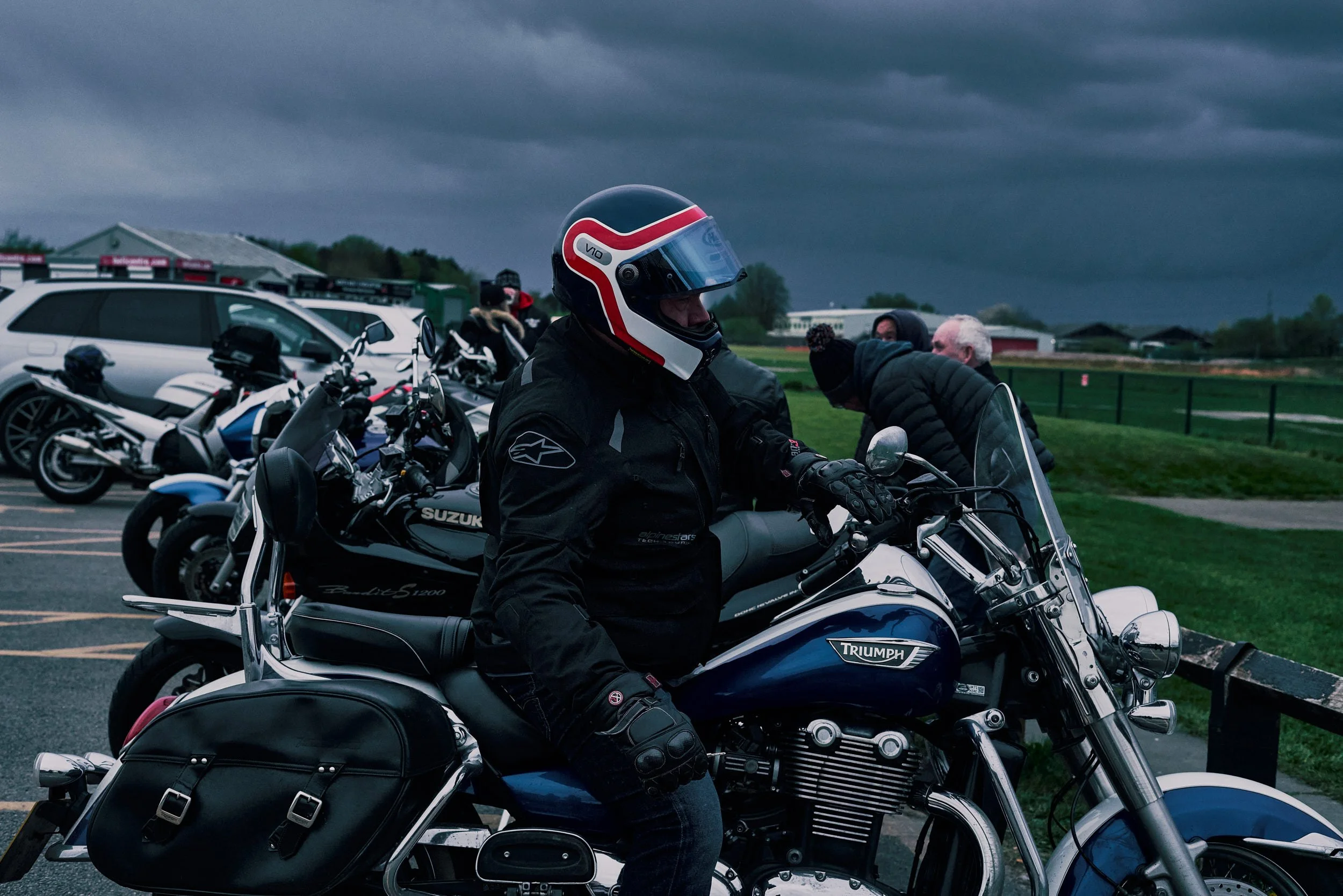 the sky was heavy with dark clouds, hanging low over the meet, a silent warning that rain was coming